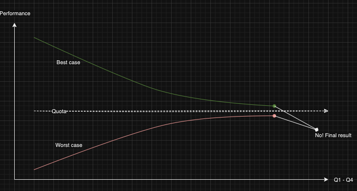Both the best case and worst case should eventually converge and be closer to the forecast. The forecast should be closer to your Quota. Ideally above it, if you aspire to be overachiever and get nice sales bonus. At Microsoft, if I remember correctly, achieving at least 70% was considered to be ok enough for you to continue the following fiscal year. Less of that, I believe, required some sort of explanation which should include forces out of the control, such as "devaluation of currency" or "oil prices dropped by 50%" that would affect all your customers.